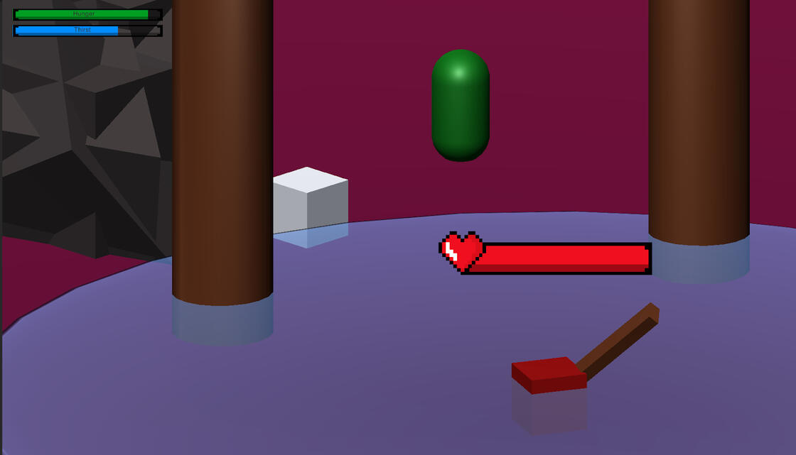 For the first couple months of working together, my team created several prototypes to test various ideas and mechanics. We weren’t exactly sure what we wanted to make yet, and explored various styles of gameplay. One of the prototypes that I made during this time focused on testing a 3D game environment as well as Unity’s baked in animation tools. At this point, my team was interested in including survival elements, so this prototype featured bars for hunger and thirst, as well as a simple enemy.