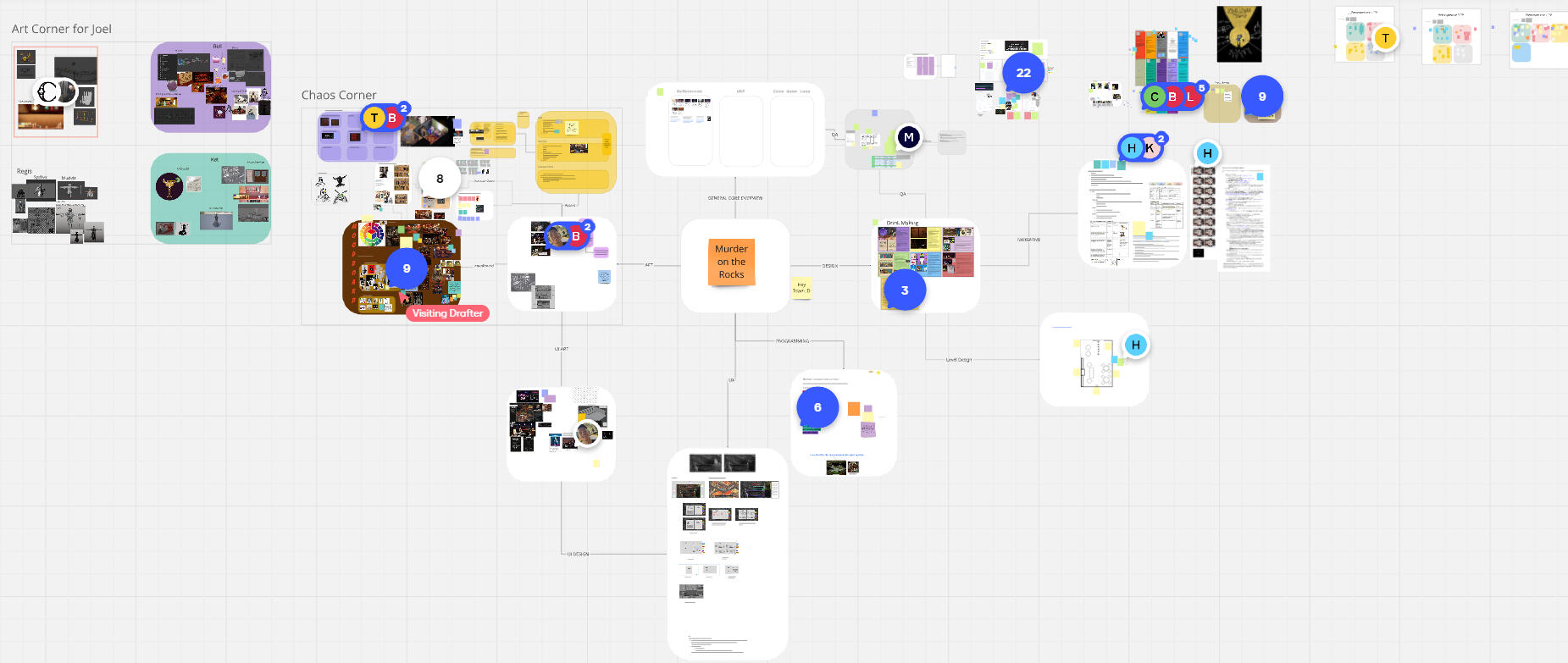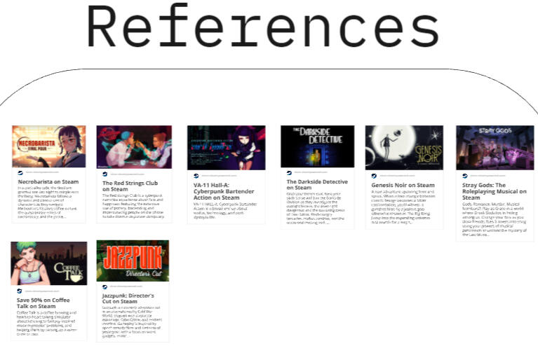 Going into this game project, I had only worked with a couple of the team members previously. I knew we could rely on the narrative and art abilities of the team, so I wanted to suggest ideas that could play on those strengths. One of the possible themes was ‘Put a Twist on It,’ so I thought of making a detective game where the suspects come to the detective rather than them having to search for them. This idea led me to a bar setting, where the patrons were all possibly involved in a murder mystery.Once we had decided on a game idea, we took some time to research and play through other games which focused on narrative and had drink making, or crafting components. Red Strings Club was one of the largest inspirations for the vibe and atmosphere of the environment. I also took notes from Coffee Talk and Tavern Talk for how to build the drink crafting system.