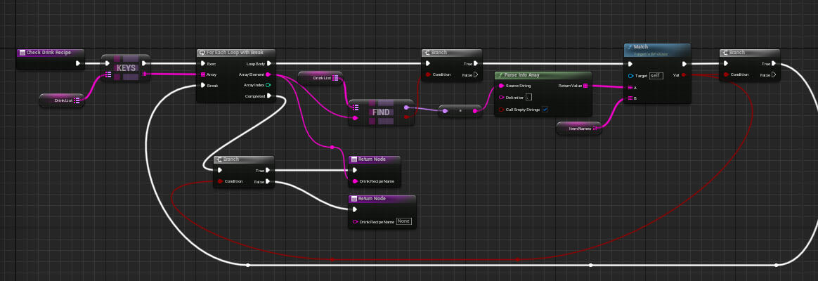 We had initially tried to create a more ambitious crafting system, which focused on tactile elements and would require manipulation of objects in 3D space. The programmers and I did have early success creating a recipe system, which kept track of the ingredients added and checked them against a table of possible drinks, but the 3D manipulation had issues. The ingredients were tricky to manipulate into place, and didn’t always stay within the bounds of the bar. As a team, we ultimately felt we would not have enough time to both implement and iterate on the system. Instead, we shifted to a UI based approach, which allowed us to keep the underlying recipe system and main loop of actions for the player.