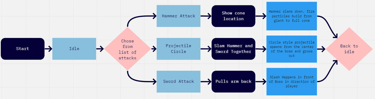 True to the original game design document, the boss builds on the two giants’ attacks by wielding both a hammer and a sword. The boss has three total types of attacks he can perform; two of which are variations of the sword giant and hammer giant’s attacks. The sword creates a flaming slash that moves down toward the player, while the hammer creates a cone of fireballs. During the third attack, the boss slams both of his weapons together to create a ring of fire that emanates outward.